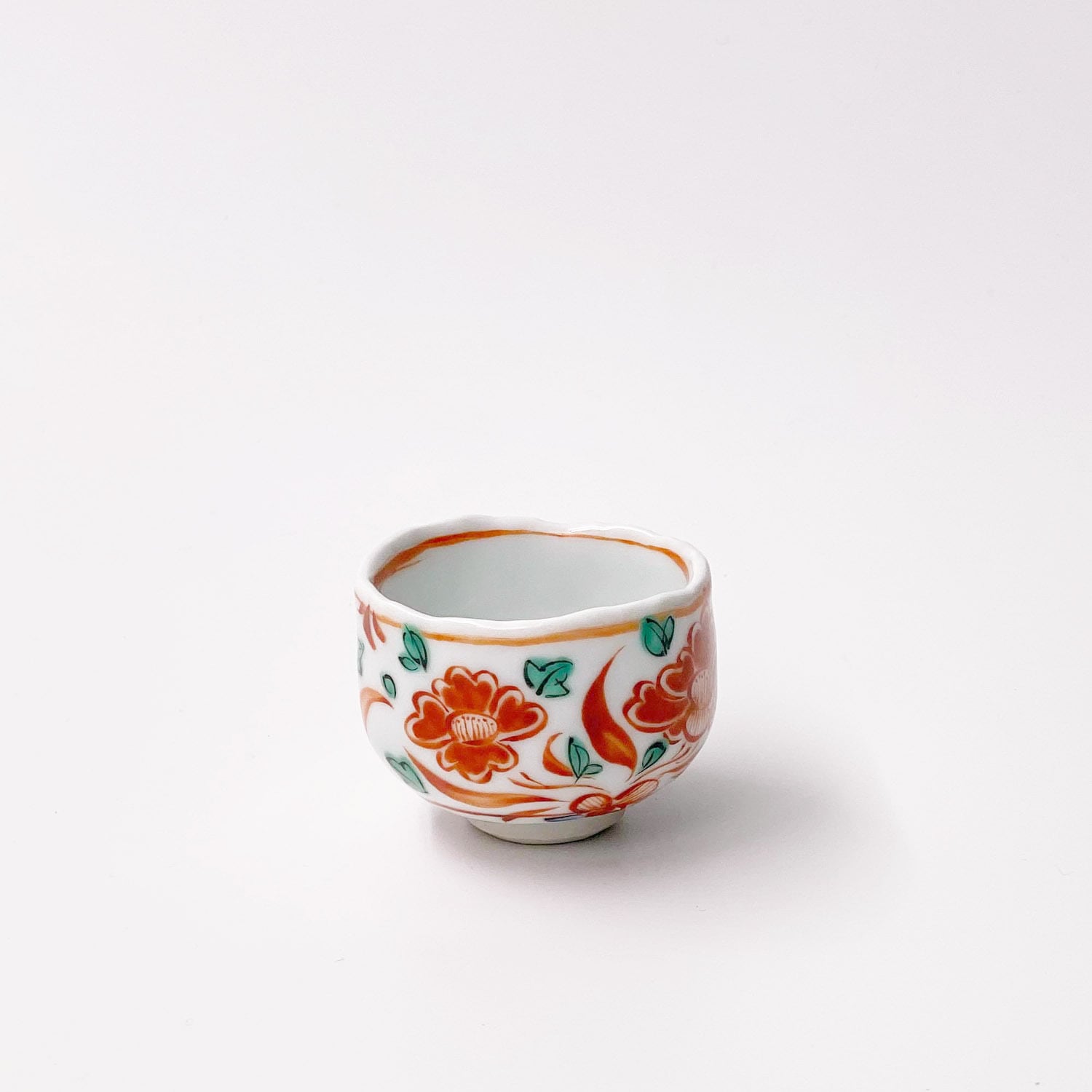赤絵手びねり盃小/Hand-builed sake cup,colored flowers (small)