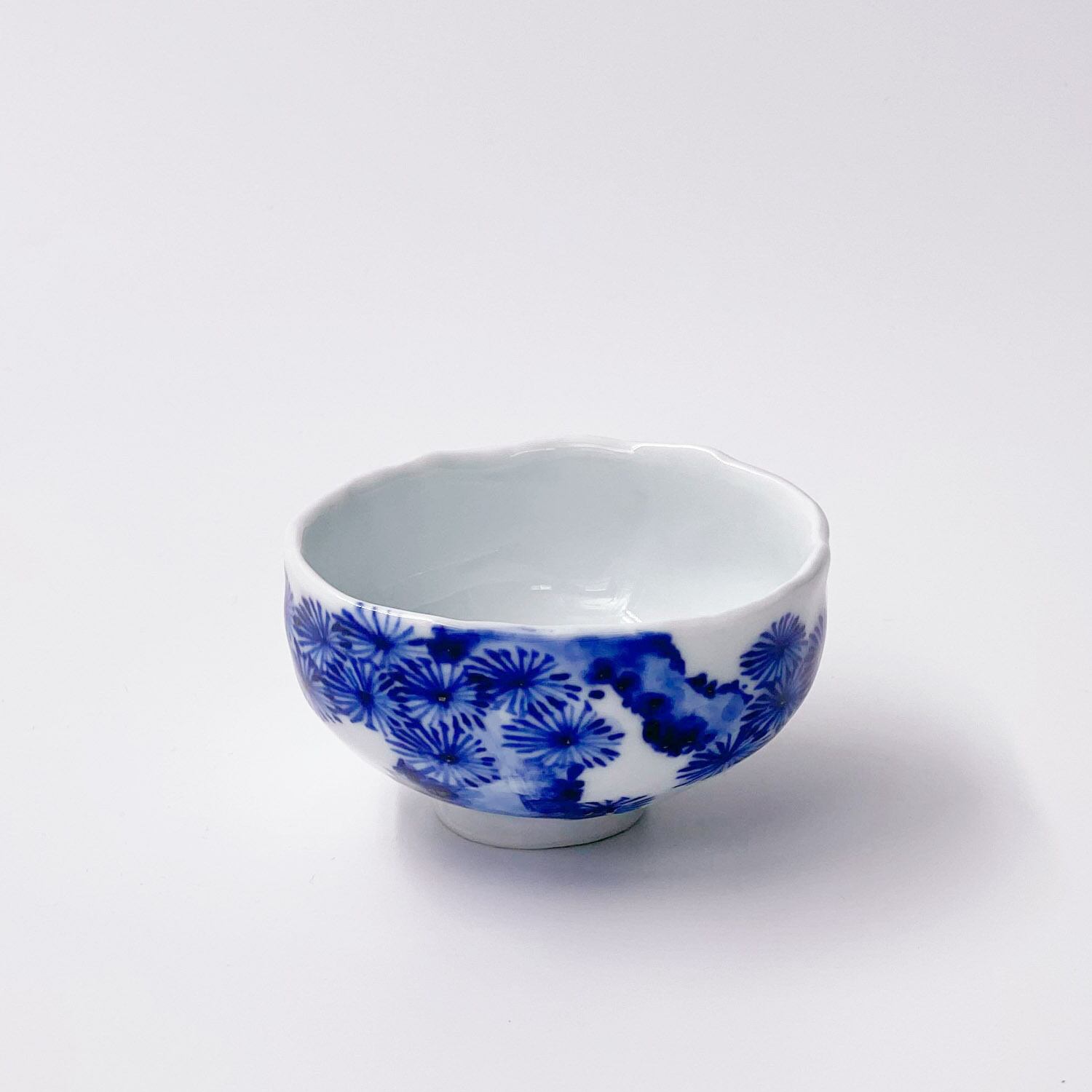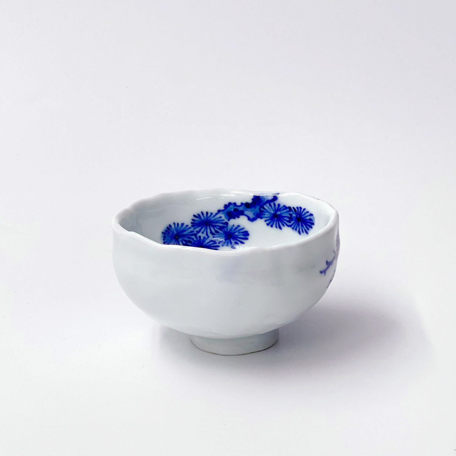 染付で松を描いております。磁器を用いての手びねりの盃は清潔感がありつつ温もりがあります。手びねりですので、写真のものとは形が違いがある場合があります。