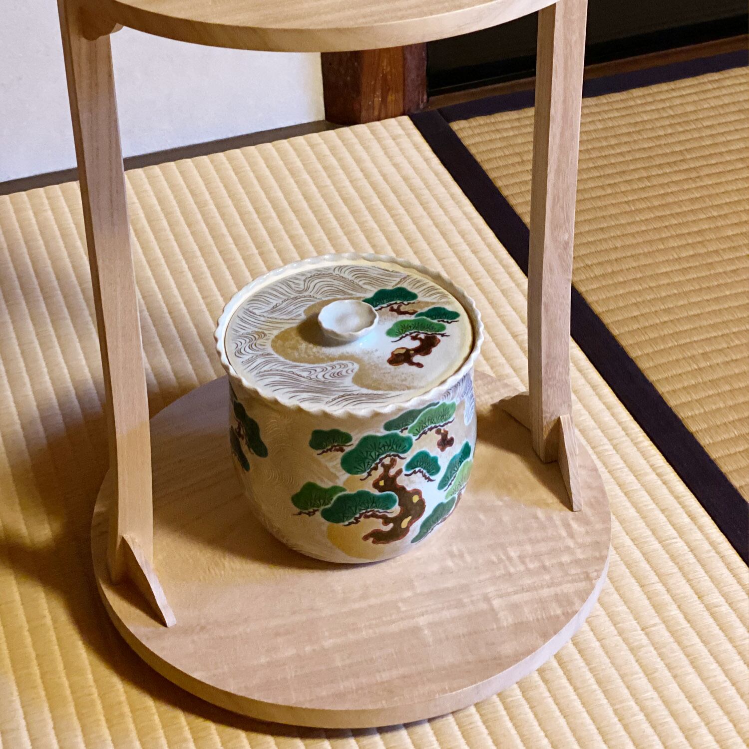 This Mizusashi(fresh water container) has a picture of Matsushima (pine trees and islands), and this is popular design from the Edo period.A lot of gold is used for this mizusashi, but they are very elegant and cool.Because they are painted on our pale blue glaze which is our Makuzu's traditional one.